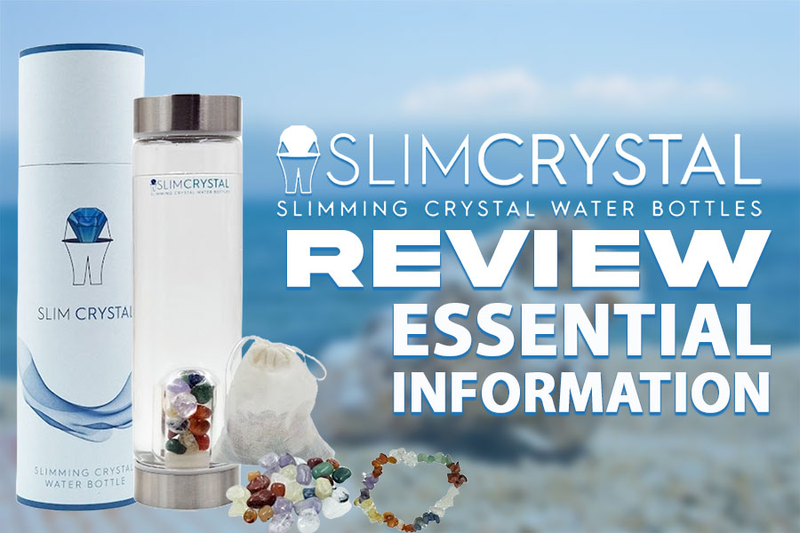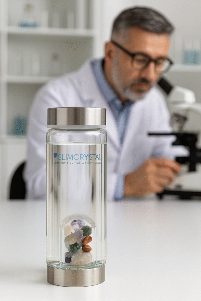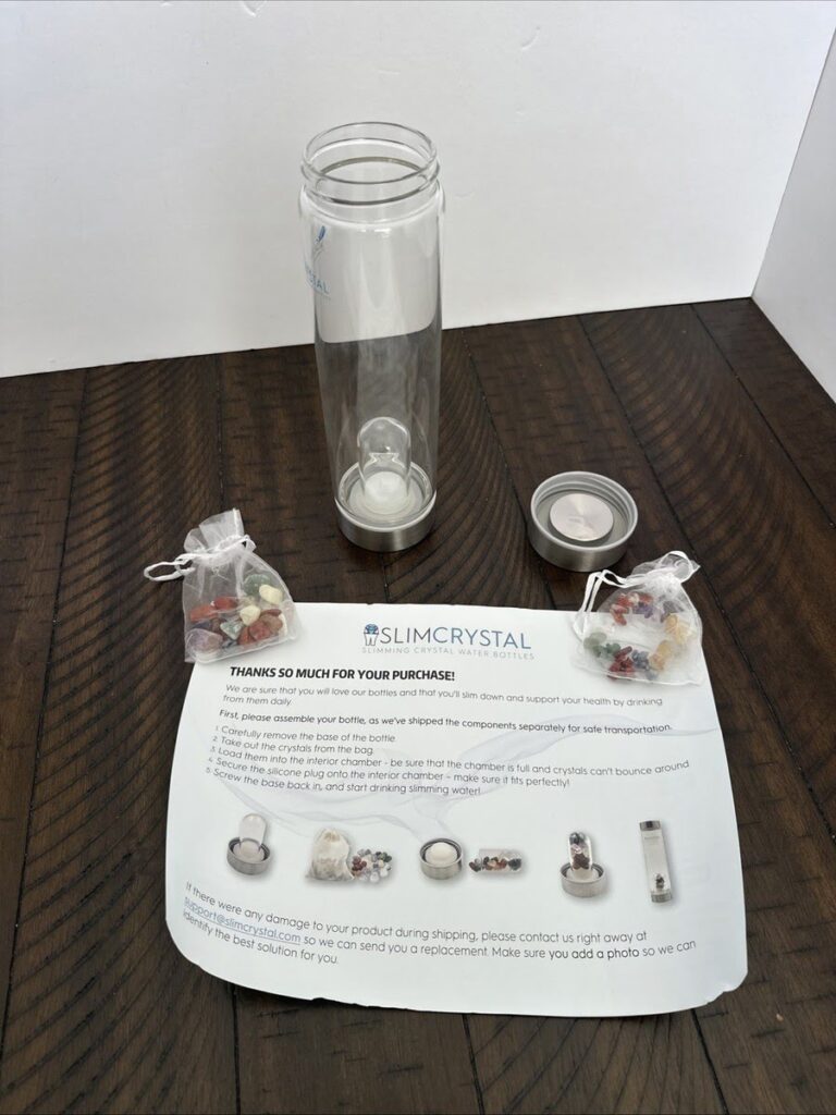 SlimCrystal is a beautiful glass water bottle filled with a mix of natural crystals.